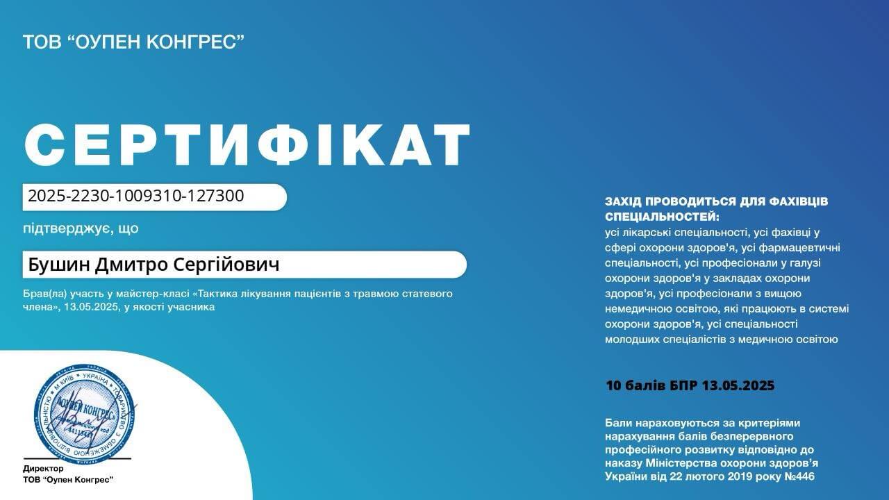 Був у лікаря Бушина Дмитра Сергійовича, хочу подякувати за професіоналізм та уважне ставлення до кожної дрібниці. Клініка залишила приємне враження.