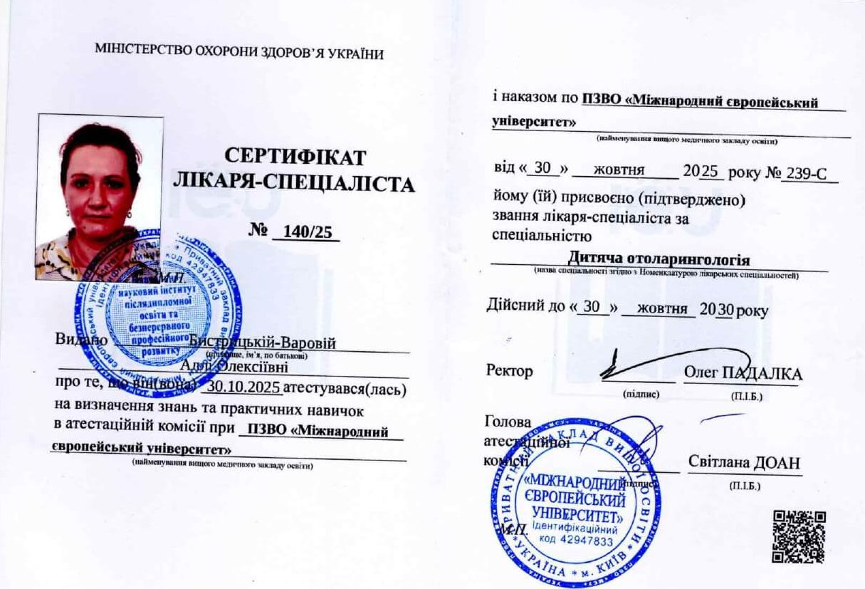 Була у цій клініці в двох ЛОРів з різними проблемами, дуже сподобалась саме Бистрицька-Варова А. О.. Вона була дуже уважна. Незважаючи на мої скарги тільки на горло і нежить, вона все ж провела повний огляд. Пояснила мені можливі причини проблем і на що варто звернути увагу, що перевірити. По лікуванню все ок. Немає нав'язливого випарювання додаткових послуг за додаткові кошти. Тільки в разі необхідності. За що їй дуже вдячна.