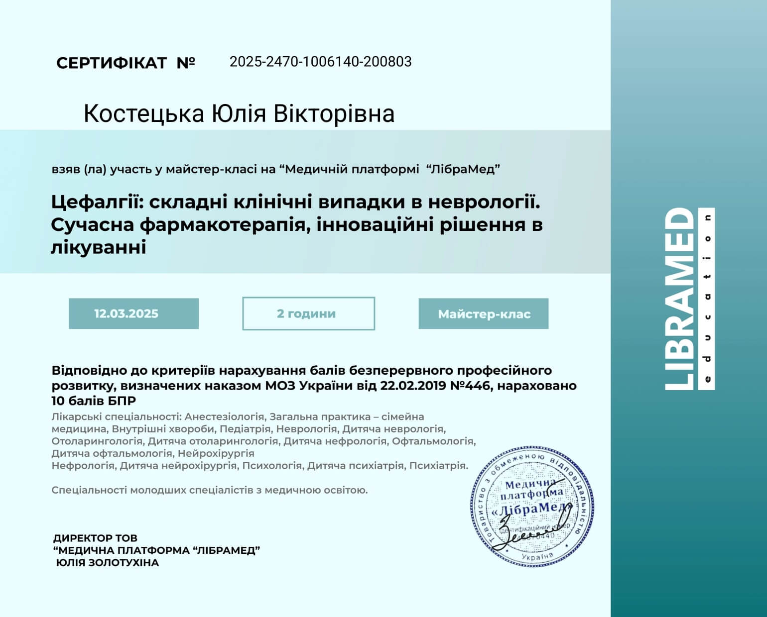 Відгук з сайту. Фахівець: Костецька Юлія Вікторівна (Неврологія). Філія на Оболоні