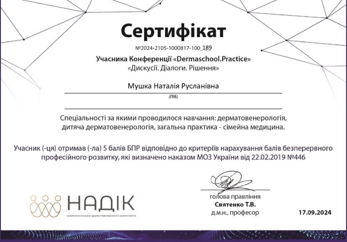 Дякую лікарю дерматовенерологу Мушці Наталії Русланівни за професіоналізм та людяність.
