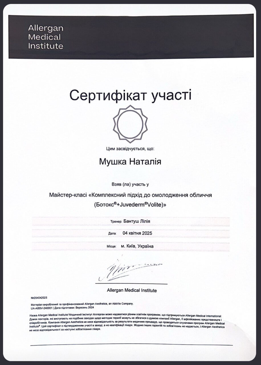 Відгук з анкети. Фахівець: Мушка Наталія Русланівна. Напрями: Дерматологія / дерматоонкологія, Косметологія. Філія на Чернігівській