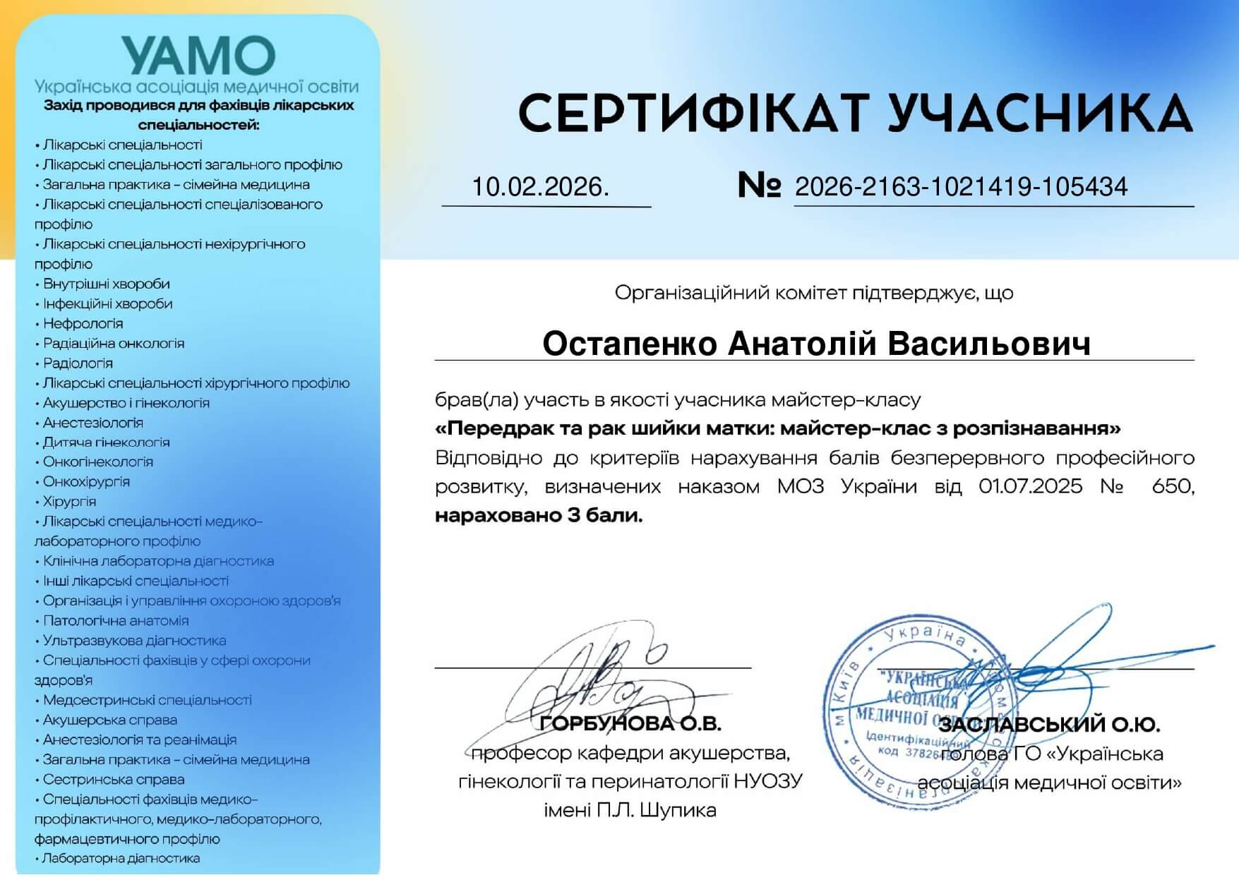 Доброго дня. Хочу залишити відгук про лікаря-проктолога Остапенка Анатолія Васильовича. В кінці січня 2026 року робили операцію по видаленню геморою ІІІ ступеню моєму чоловіку. Зараз місяць потому з впевненістю можу сказати, що Анатолій Васильович майстер своєї справи: дуже швидко й професійно все зроблено; лікар вислуховує всі скарги, даючи слушні поради. А про почуття гумору цього чудового лікаря я можу говорити вічно - це дуже позитивна людина, яка викликає лише довіру та позитив. Завдяки цьому всьому лікування проходить легко. Сподіваємось, що результат закріпиться на довго. Анатоліє Васильовичу, щиро Вам дякуємо.