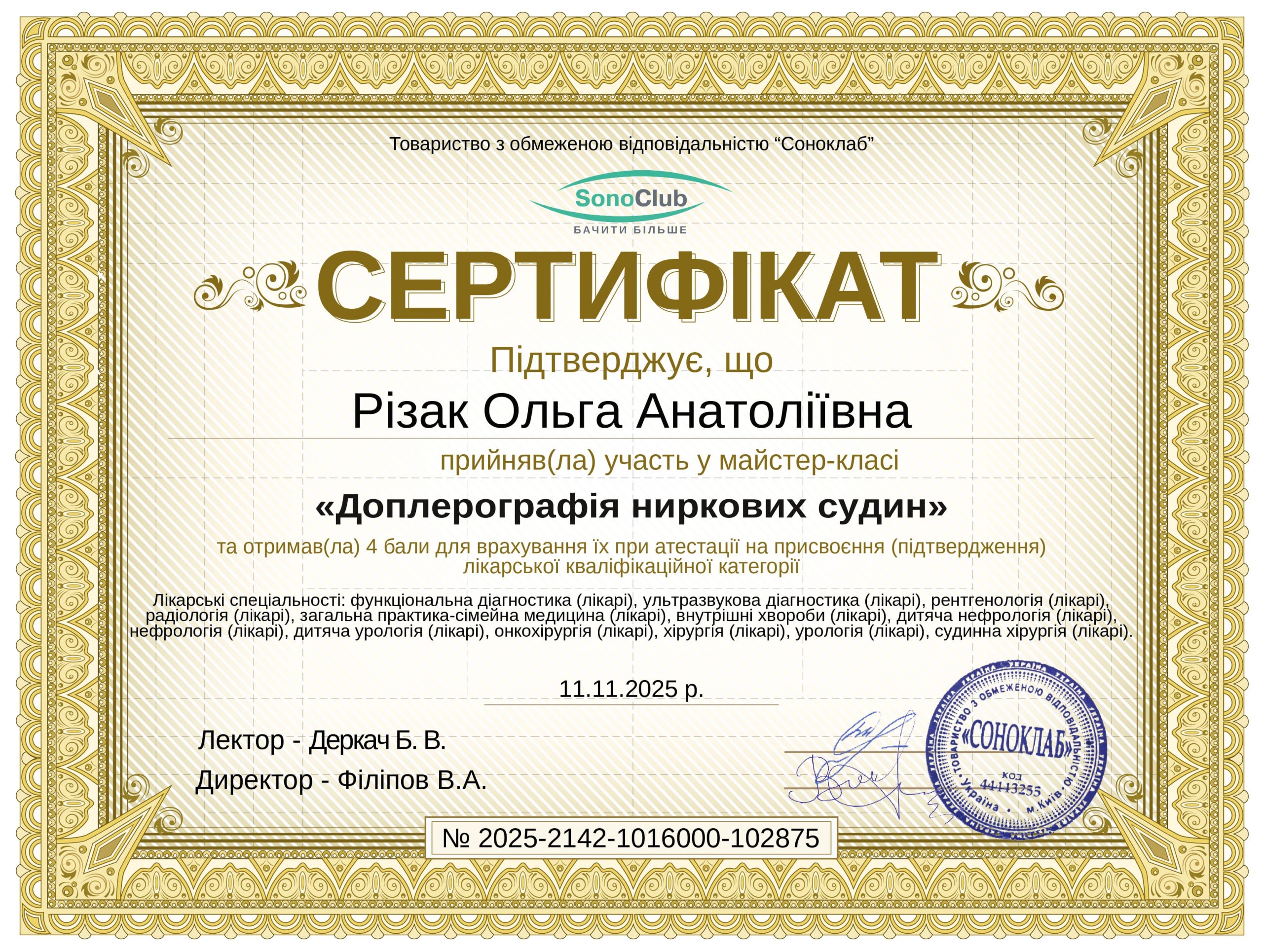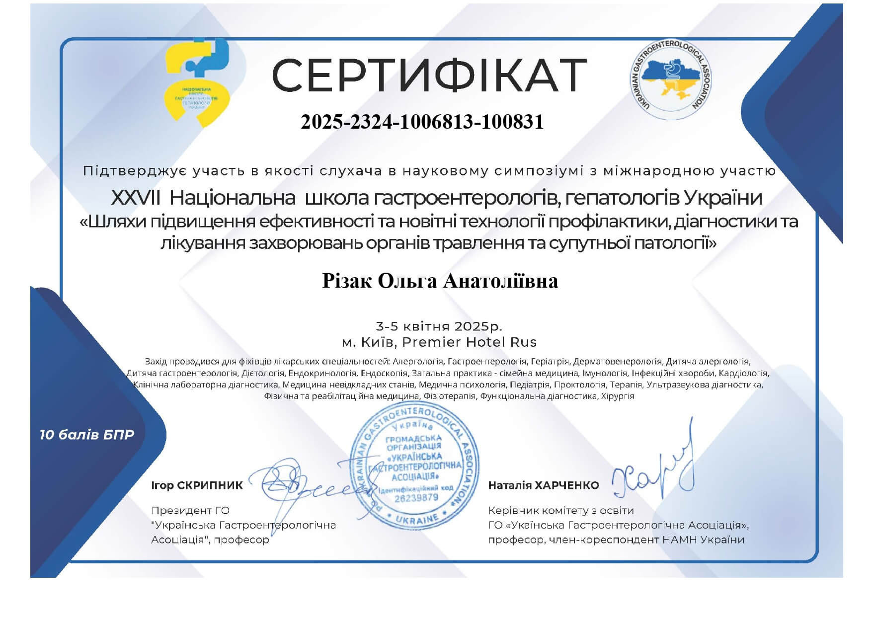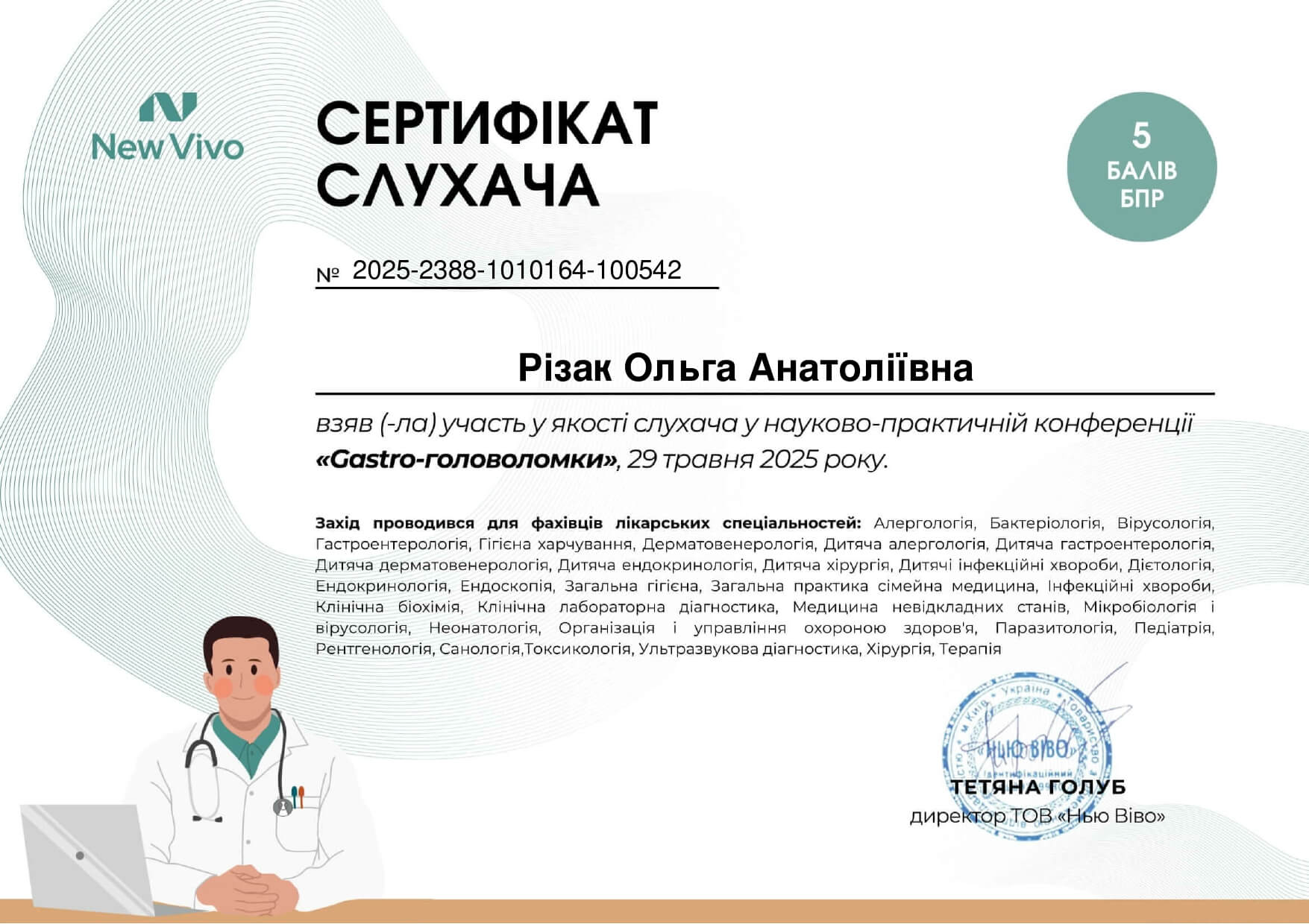 Відгук з сайту. Фахівець: Різак Ольга Анатоліївна (Ультразвукова діагностика (УЗД)). Філія на Печерську