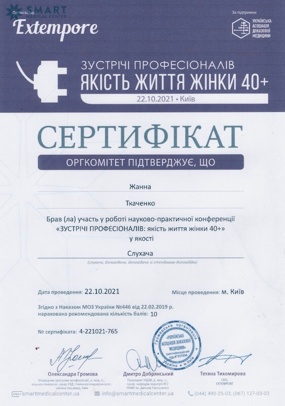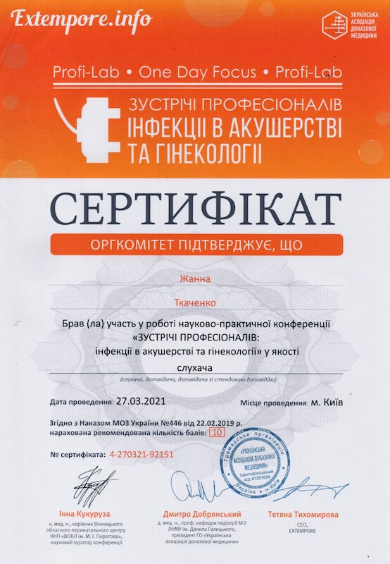 Відгук з сайту. Фахівець: Ткаченко Жанна Сергіївна (Гінекологія). Філія на Печерську