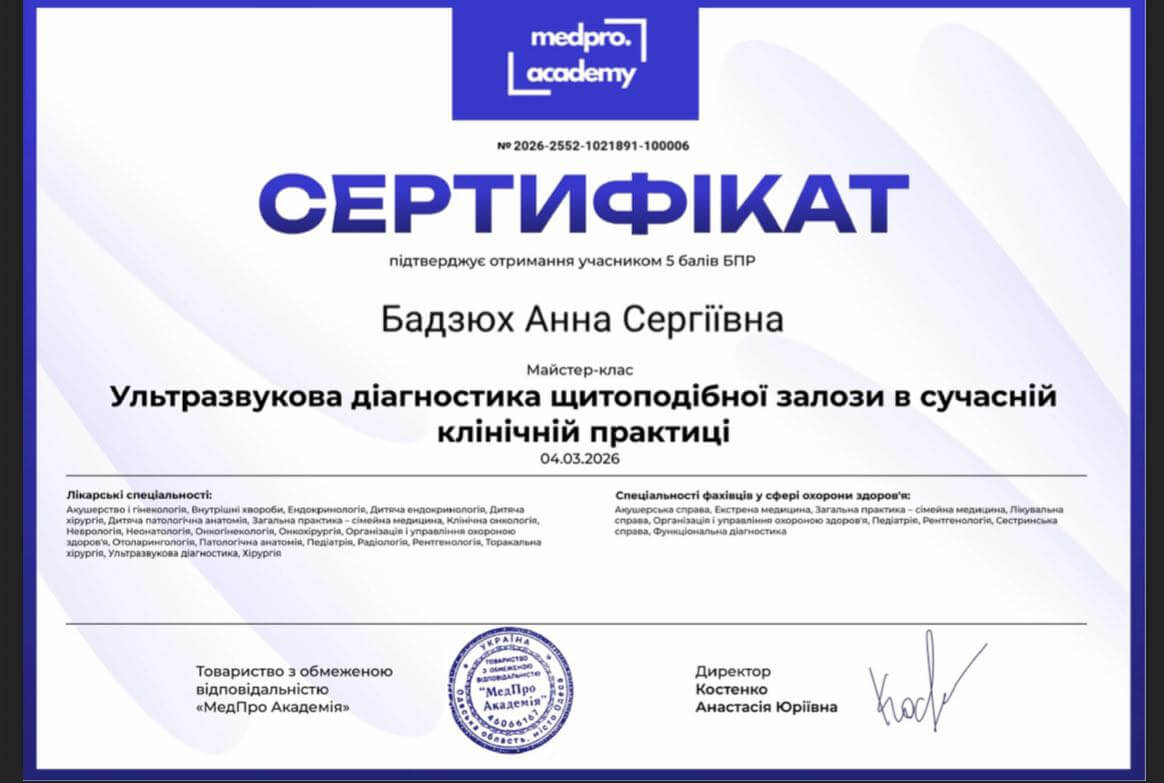 Хочу поділитись відгуком про лікаря, який встановив мені некоректний діагноз та лікування, що призвело до пневмонії. На третій день хвороби я прийшла до лікаря Бадзюх зі скаргою на біль у горлі, сильний кашель та температуру 39 . Я прийшла з хлопцем, на прийом, бо мені було важко говорити через біль у горлі, проте вона не дозволила йому бути на прийомі і не ввічливо закрила двері прям перед його носом, хоча я просила, щоб він був присутній на прийомі. Запросила вона його лише коли озвучила діагноз у кінці. Наче все було добре питання щодо стану, оглянула, послухала дихання. Я зробила аналіз крові, який мав бути готовий через декілька годин після прийому. Рентген мені сказали не робити, бо нащо просто так облучати, так сказала лікар. Мені були виписані спрей зі спиртом у складі, сироп та таблетки противідхаркувальні. Діагноз поставлений: гострий фарингіт та трахеїд. Ввечері прийшли аналізи, які показували сильне запалення, але лікар їх не дивилась. Все що мені було прописано тільки погіршило мій стан і мій жорсткий кашель став нестерпним і ще більшим, до болю в ребрах і грудях. Потім від сильного кашлю я розідрала горло і не могла говорити декілька днів і що гірше спати майже 3 доби з температурою 39.9 я не могла заснути через сильний кашель. Через 2 дні прописаних препаратів я відмовилася від них, бо мені було все гірше. Ще через 3 дні моє горло відновилось і на повторному прийомі у терапевта Шляхової Катерини виявилось, що у мене пневмонія. Лікар одразу побачила ще по перших аналізах, що там запалення і його потрібно лікувати не сиропом чи спреем від горла, а антибіотиком. Завдяки недобросовісному лікарю Бадзюх Анні ситуація дійшла до пневмонії, а моє лікування затягнулось на місяць лікування і відновлення. Ні в якому разі не рекомендую лікаря Бадзюх Анну, бо це може коштувати життя!