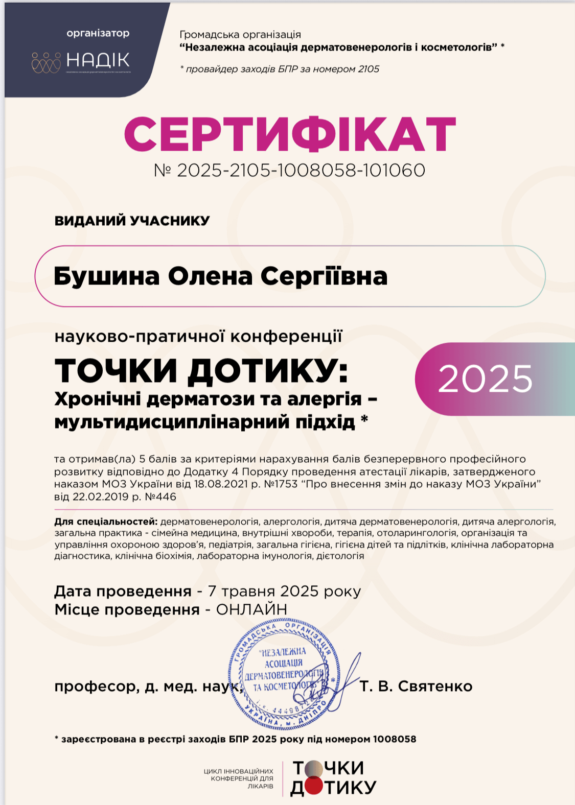 Наталіє, щиро дякуємо за ваш втішний відгук про лікаря-дерматовенеролога Олену Бушину. Бажаємо вам міцного здоров'я!