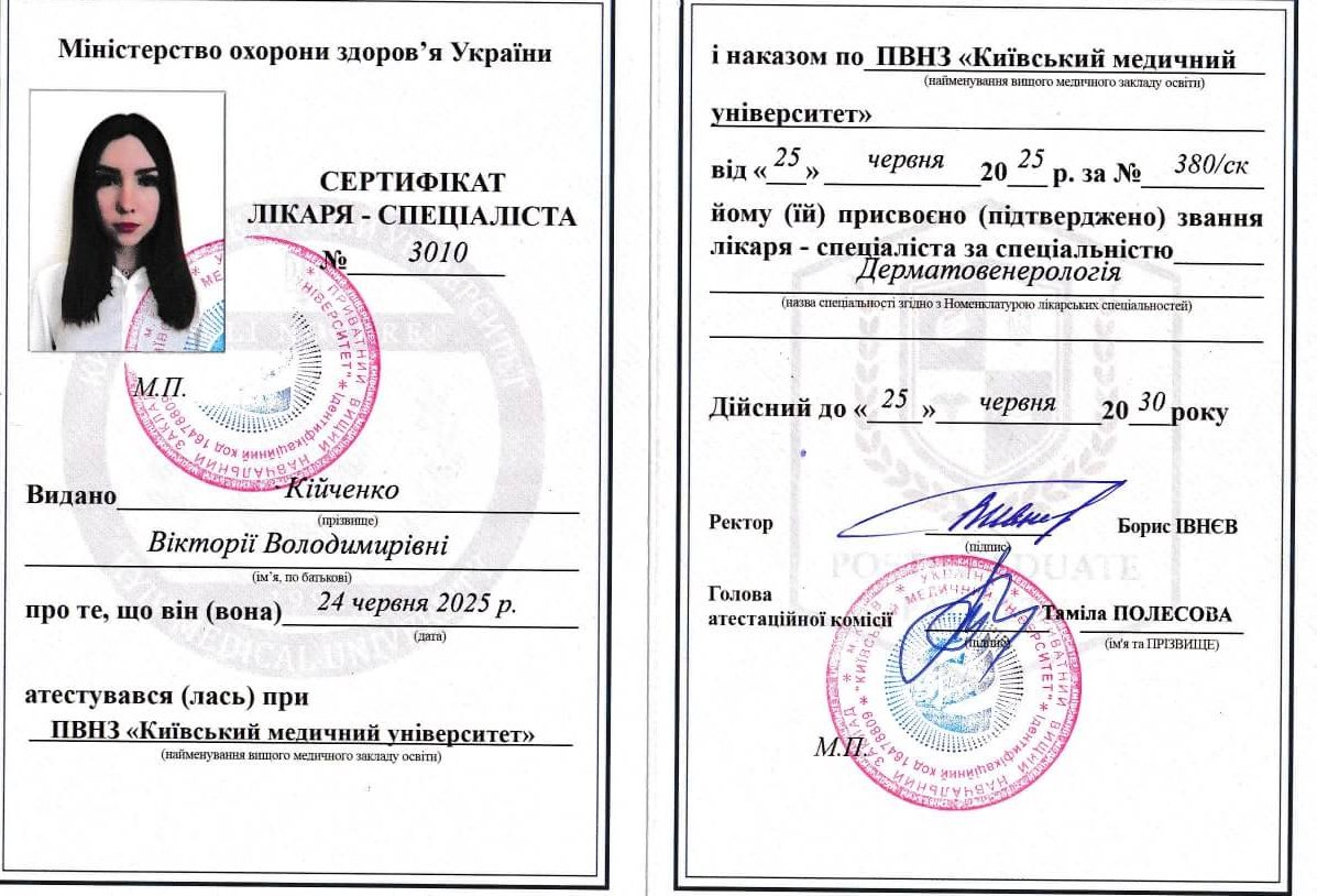 Юліє, дякуємо за ваш втішний відгук про лікаря-дерматовенеролога Вікторію Кійченко. Бажаємо вам міцного здоров'я!