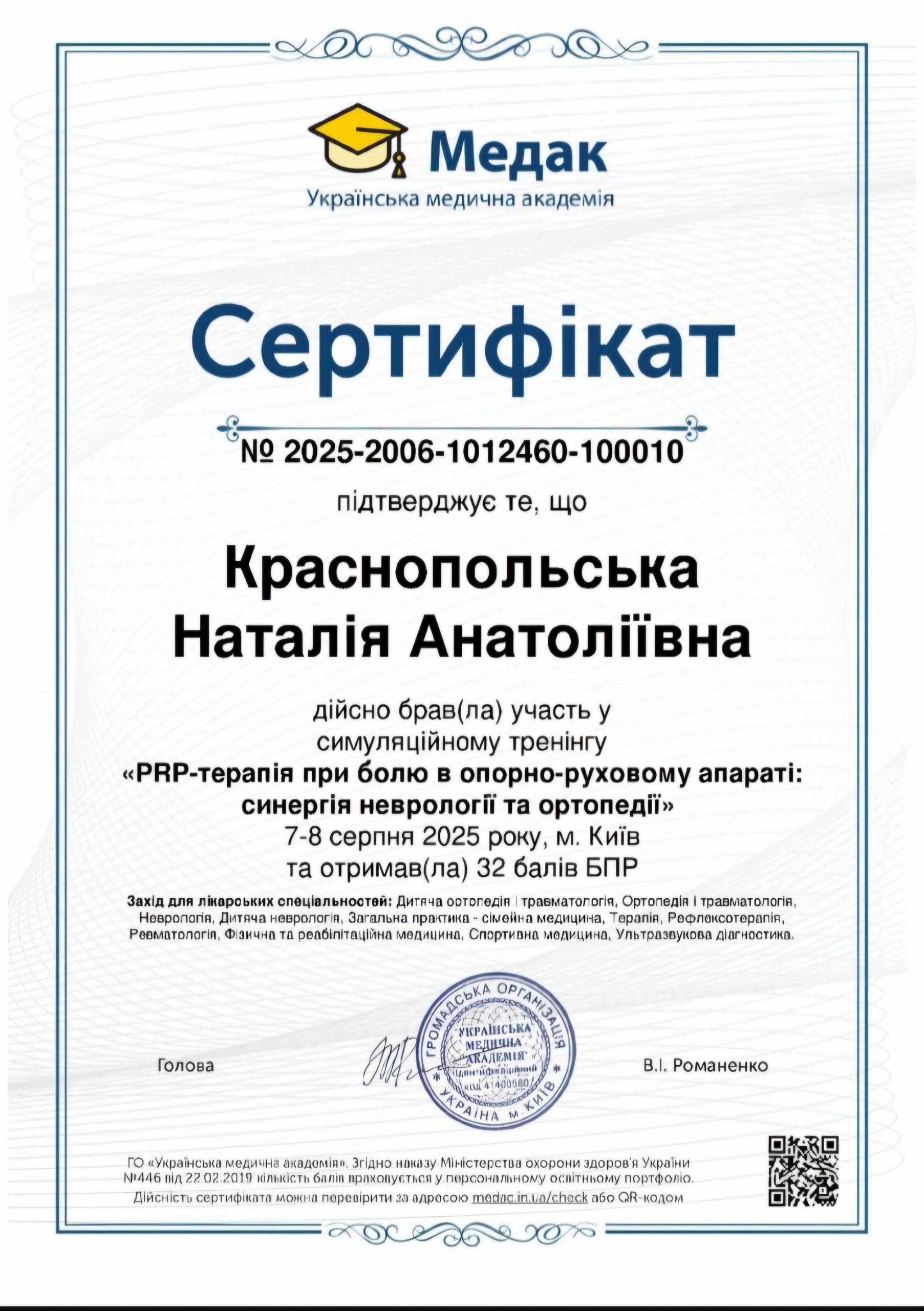 Олено, дуже дякуємо за ваш позитивний відгук про лікаря-невролога Наталію Краснопольську. Бажаємо вам міцного здоров'я!