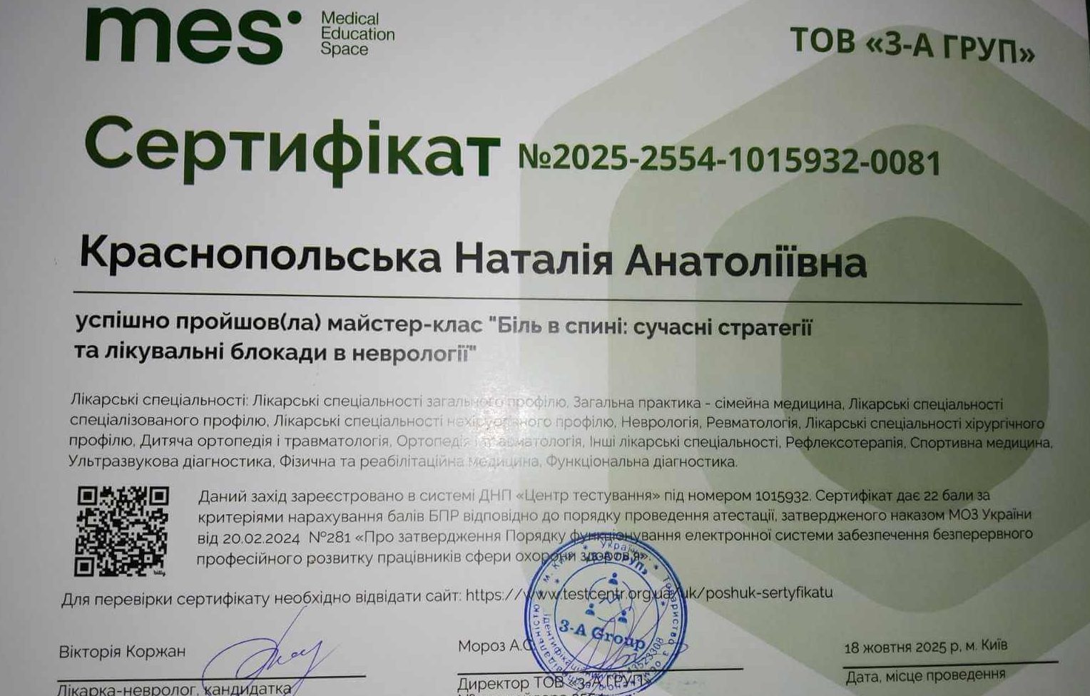 Софіє, дуже дякуємо за вам позитивний відгук про лікаря-невропатолога Наталію Краснопольську. Бажаємо вам мінцого здорво'я!