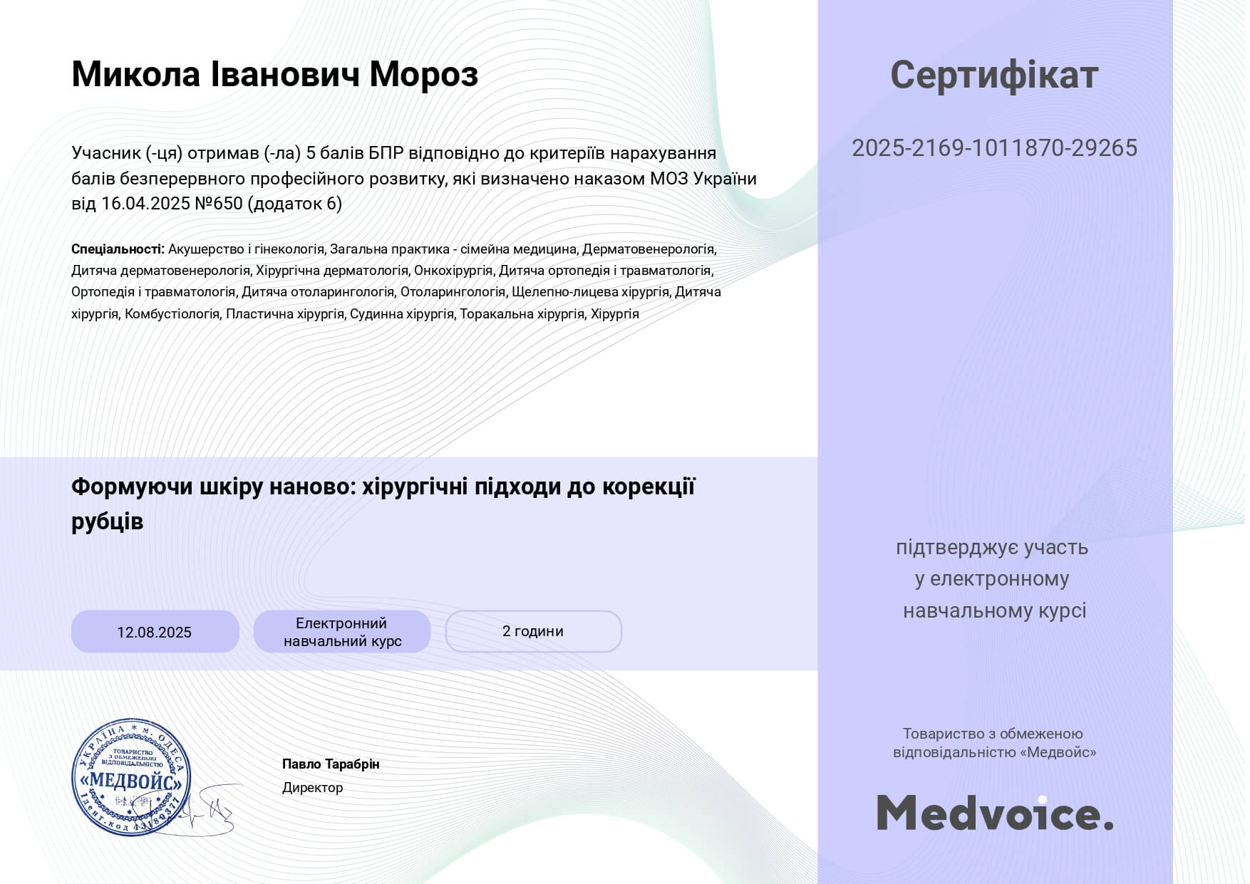Очень рекомендую хирурга Мороз Николая Ивановича, топ хирург, пришла на консультацию и уже через 15 мин после консультации мы на операционном кресле решили проблему беспокоившую меня 6 лет, швы очень хорошие, у меня склонность к коллоидным рубцам, но благодаря врачу этой проблемы удалось избежать благодаря индивидуальному подходу! Действительно квалифицированный специалист!