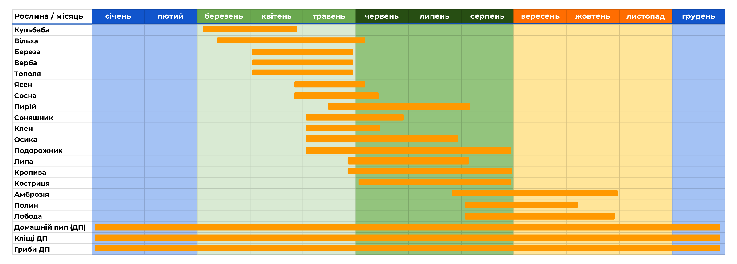 | Полин | Береза, олива, злакові трави, амброзія, ромашка аптечна, ромашка садова, соняшник, зерняткові, кісточкові, ківі, манго, горох, сира морква, селера, сирі помідори, аніс, каррі, кріп, червоний перець, кмин, коріандр, арахіс, лісовий горіх, латекс |